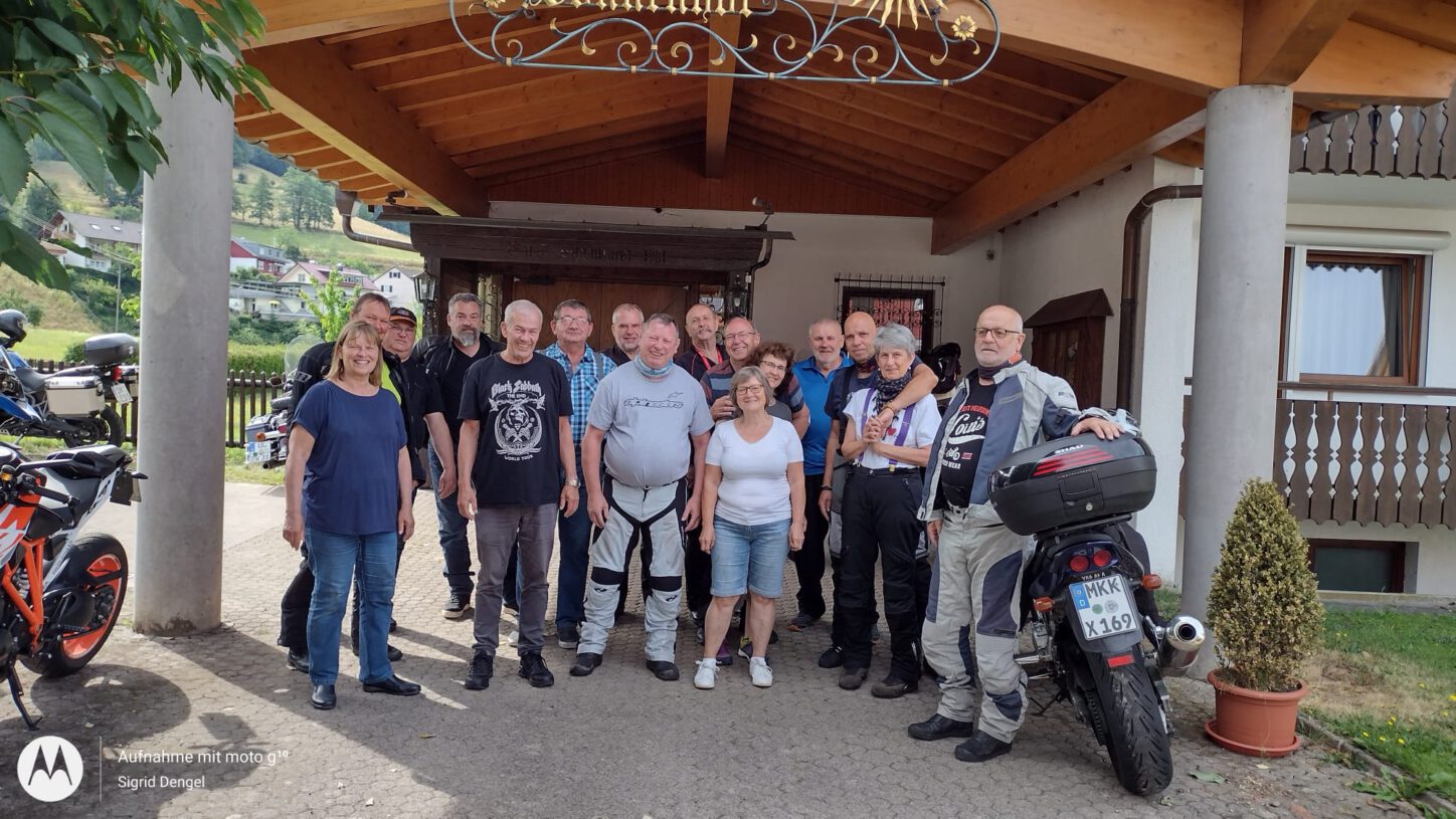 DV Berlin / DV Würzburg Am Freitag, 7. Juli 2023 sind Gerd und ich mit unserem Trike Richtung Schwarzwald gestartet. Dort waren wir am Sonntag mit 23 anderen Bikern aus ganz Deutschland von Ostfriesland bis Passau zur abstinenten Motorradtour verabredet. Nach Zwischenstopps in Allmenhausen (Thüringen) und Sinsheim sind wir dann am Sonntagmittag im Hotel Gasthof Krone in Simonswald (Schwarzwald) angekommen und waren nicht die ersten. Wir wurden sofort wie alte Freunde mit großem Hallo begrüßt, obwohl wir erst zum zweiten Mal dabei waren. So nach und nach füllte sich der Vorplatz des Gasthofes. Nach dem Bezug der Unterkünfte trafen wir uns zum gemeinsamen Abendessen, bei dem es sehr lustig zuging.